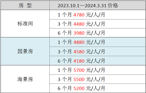 备注:元旦1天,春节7天(年三十至初六)每人每天另加收200元;10天体验每人每天另加收300元