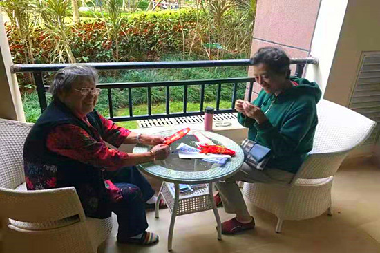 为活跃旅居生活,基地组织了各种适合老年人的活动,有舞蹈队、太极班、书法班、模特队、合唱班、手工制作、欢迎宴、饺子宴、生日宴、婚纱照、组织周边游等等,使我们原本单调的旅居生活充满了情趣。入住第二天,徐经理就带领小管家刘闪闪、王博入户,不但送来必须的日常生活用品,还详细了解各位老人的健康状况并登记造册,把老人健康放在心上,定期为老人量血压,测血糖。每周日下午为老人免费理发。尤其是感恩节那天,徐经理带领怡海苑工作人员挨家挨户送温暖,给我们送来了慰问品,并亲自为部分长者打来洗脚水帮他们泡脚。老人家里有亲戚朋友来看望还免费接送。特别安心的是遇到大事小情有人管,像在家一样没有后顾之忧。餐厅的工作人员每天为我们准备可口的饭菜,还不时问我们有什么建议和需求。现在我们愉快的生活在怡海苑,每天在小区林荫道上散散步,和新结交的朋友们聊聊天,坐在阳台上一边看对面的海花岛一边做手工十字绣鞋垫感觉我们的旅居生活非常充实。